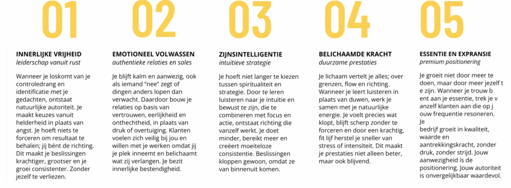 - Je bedrijf en omzet groeit door betere keuzes, focus en innerlijke rust. Niet meer vanuit harder werken en angst om alles te verliezen.